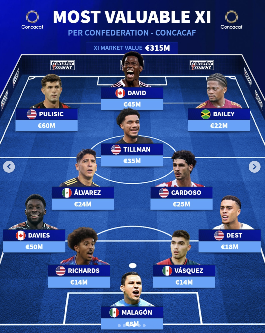 陣容總身價為3.15億歐,美加墨球其中美國有5人入選;墨西哥和加拿大各有3名和2名球員入選。員占美國球員普利西奇以6000萬歐領銜陣容。流言領銜