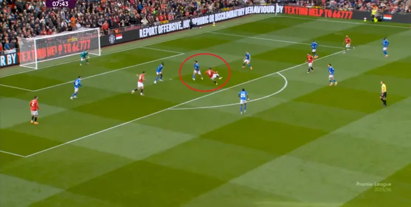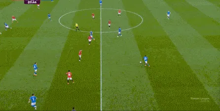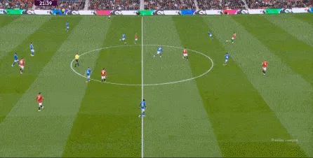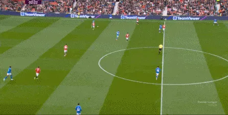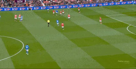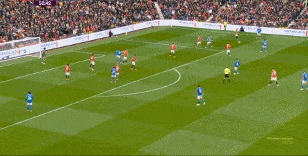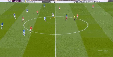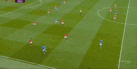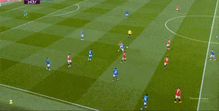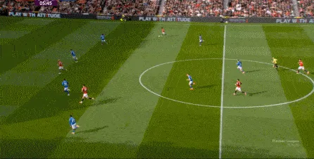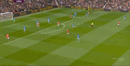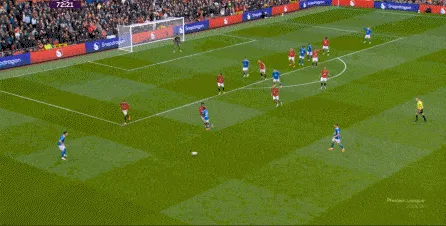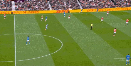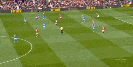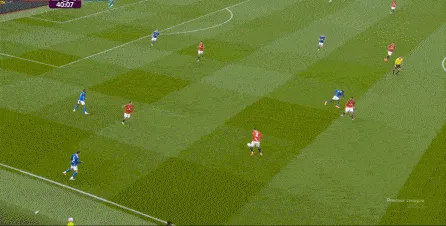 這一球?qū)嶋H上展現(xiàn)了三后衛(wèi)體系在對陣四后衛(wèi)時(shí)的優(yōu)勢,那就是對方的邊路球員一旦選擇上前壓迫曼聯(lián)的邊中衛(wèi),那么曼聯(lián)的翼衛(wèi)位置就會進(jìn)入天然的空當(dāng)里,所以理論上接球很順暢,接下來就可以用5人打?qū)Ψ降?人后衛(wèi)線: