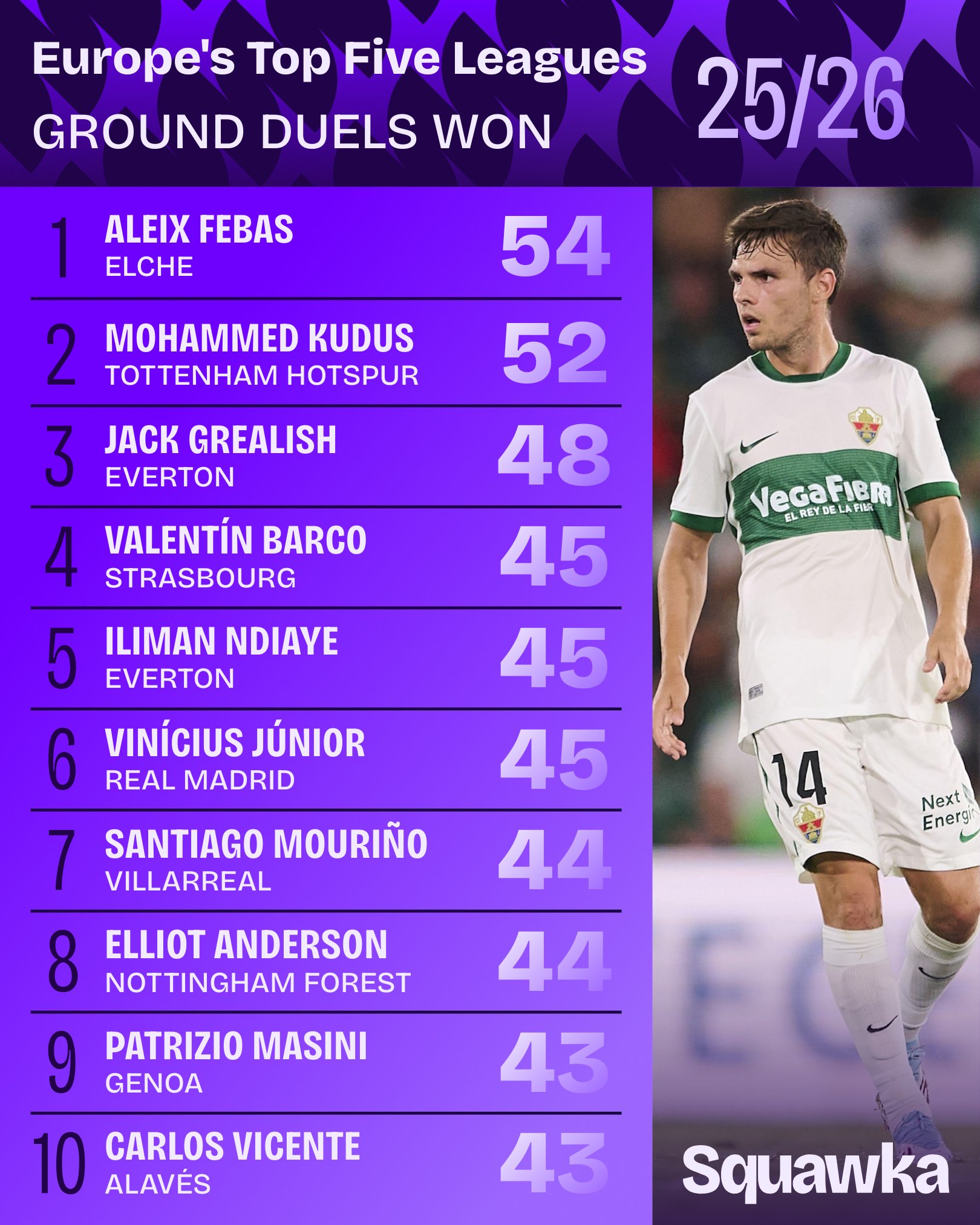 虎撲10月16日訊 Squawka數(shù)據(jù)統(tǒng)計本賽季至今五大聯(lián)賽地面對抗勝出榜,埃爾切中場費巴斯居首,地面對抗第庫杜斯第庫杜斯、勝出格拉利什分列二三。流言聯(lián)賽