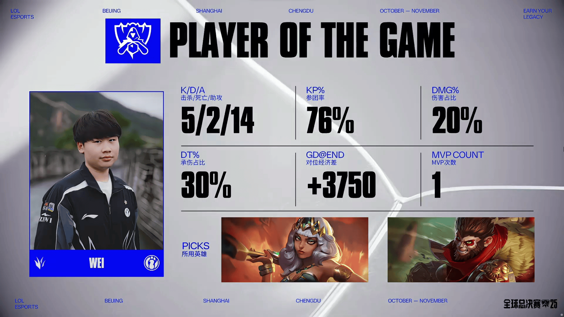 戰(zhàn)績來源:虎撲電競 戰(zhàn)績虎撲10月14日訊 在剛剛結(jié)束的S15入圍賽的比賽中,Wei猴子砍下5/2/14的拿下戰(zhàn)績,拿下IG對陣T1第二局MVP