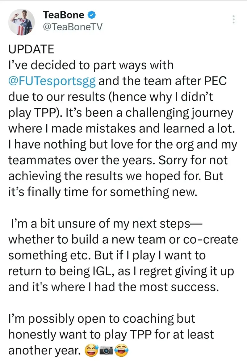 由于成績(jī)不佳(這也是我沒參加TPP的原因),我決定在PEC結(jié)束后與FUT分道揚(yáng)鑣。這是一段充滿挑戰(zhàn)的旅程,我犯過錯(cuò)誤,也學(xué)了很多。這些年來,我對(duì)俱樂部和隊(duì)友們只有愛。很遺憾沒能取得我們期望的成績(jī)。但現(xiàn)在終于到了嘗試新事物的時(shí)候了。我有點(diǎn)不確定我的下一步--是否要組建一支新隊(duì)伍或共同創(chuàng)造一些東西等等。但如果我參加比賽,我想回到IGL,因?yàn)槲液蠡诜艞壦疫@是我最成功的地方。我可能愿意接受教練職位,但說實(shí)話,我至少想再打一年 TPP。