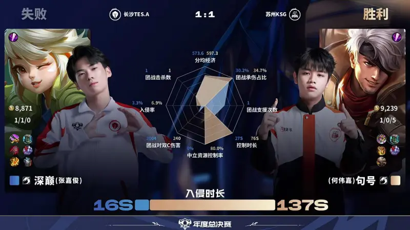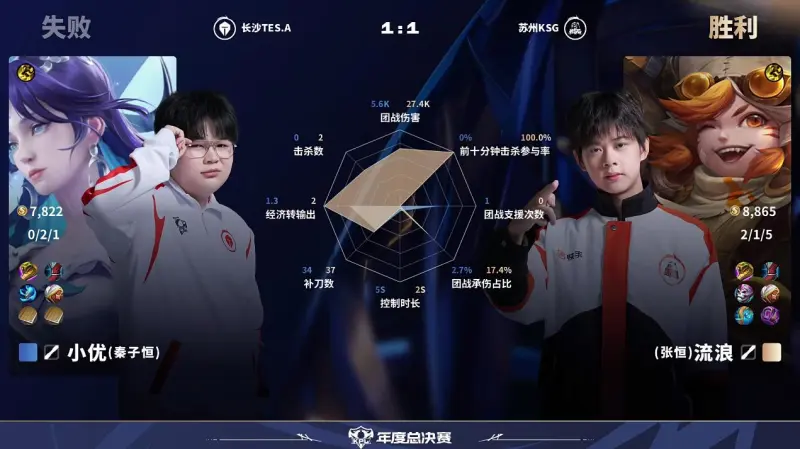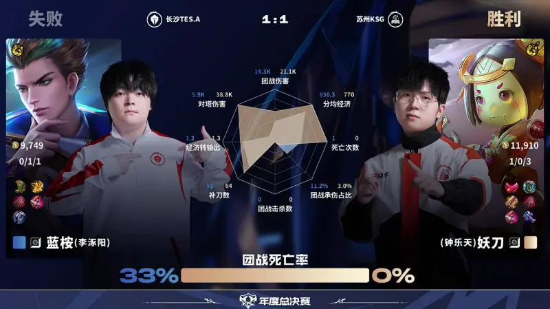 虎撲10月14日訊 KSG/TES第2局數(shù)據(jù)對比:妖刀團戰(zhàn)承傷占比3%,死亡率0%。局數(shù)據(jù)對
