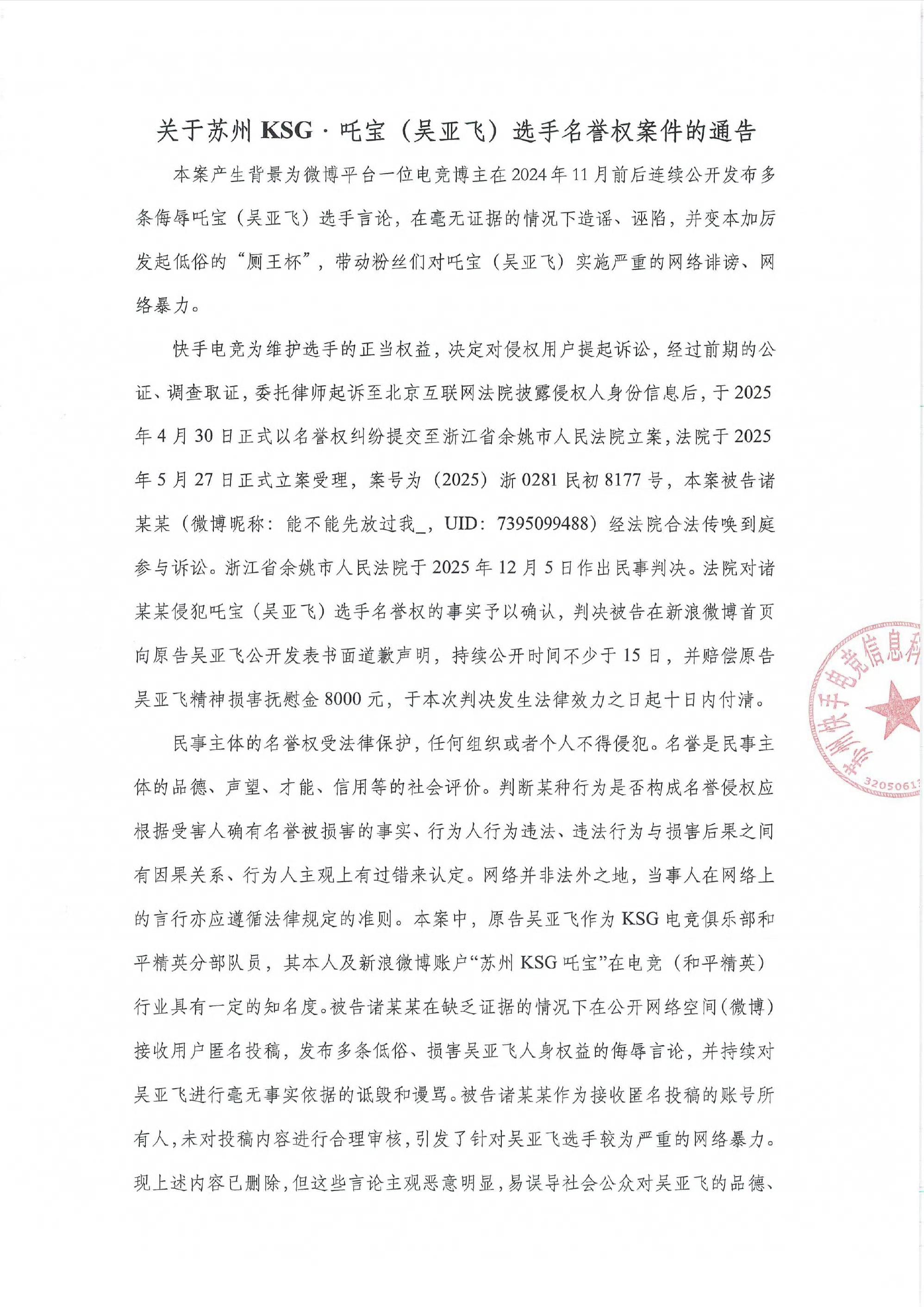 關(guān)于蘇州KSG選手吒寶(吳亞飛)名譽權(quán)案件的通告進(jìn)展,說明如下: