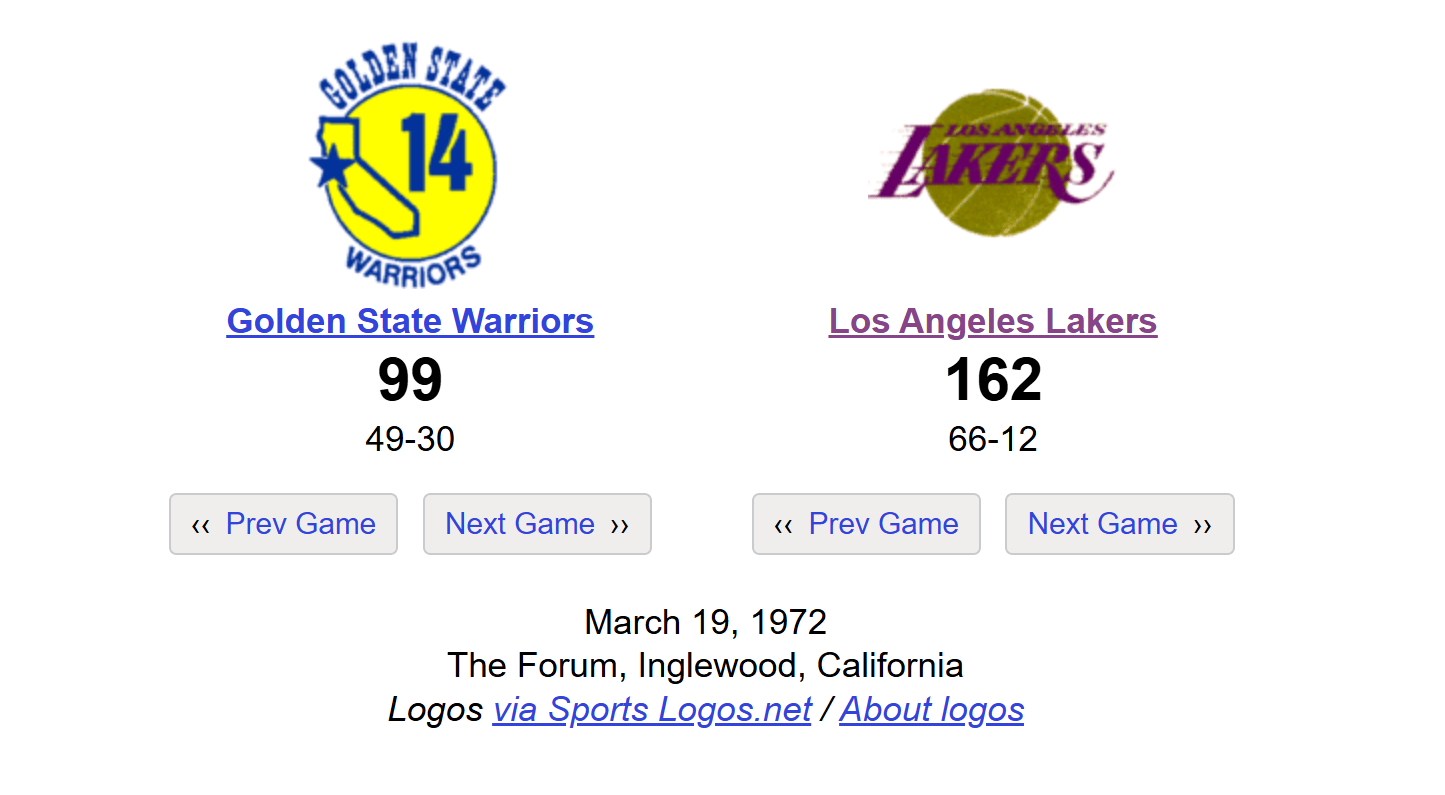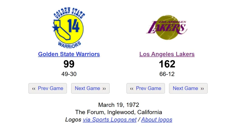 1972年的今天,湖人在主場162-99狂勝勇士。天湖