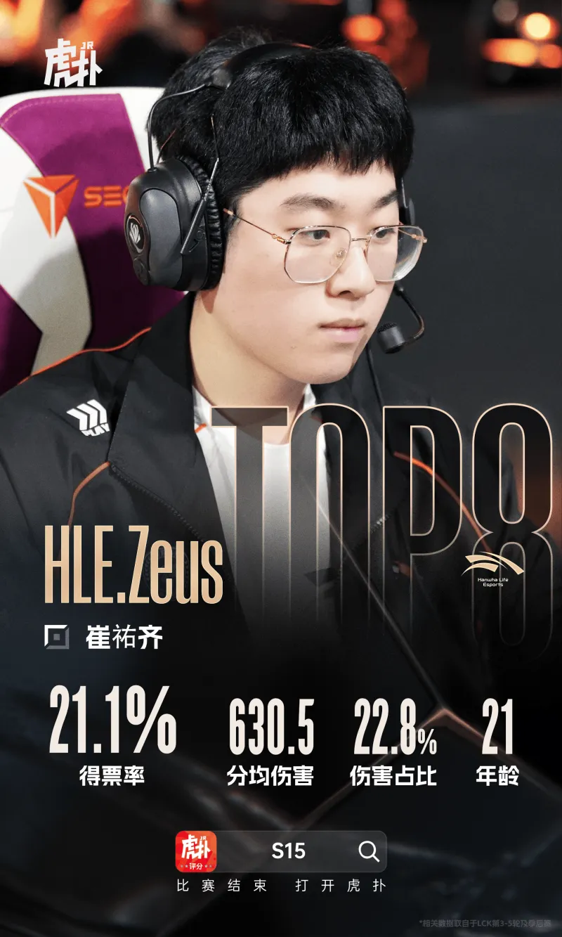 HLE.Zeus以21.1%的得票率當(dāng)選S15全球總決賽No.8選手。