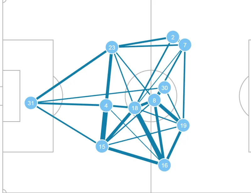 8分鐘第一個(gè)進(jìn)球就來(lái)自于強(qiáng)側(cè)姆貝膜邊路左腳斜傳到禁區(qū)無(wú)人盯防的芒特,左腳卸球右腳抽射1:0,動(dòng)作連貫流暢很輕松,黑貓的防守太松散了,沒(méi)有給到任何壓力,不管是持球人還是禁區(qū)前在的二點(diǎn)威脅。本場(chǎng)比賽發(fā)揮得不錯(cuò)的另外一名球員塞斯科在20分鐘接到B費(fèi)傳球后標(biāo)準(zhǔn)的中鋒職責(zé)分球到右邊路迪亞洛,后者內(nèi)切完成一腳質(zhì)量不錯(cuò)的射門(mén)。25分鐘同樣是強(qiáng)側(cè)姆貝膜邊路傳中球到后點(diǎn)達(dá)洛特沒(méi)停好,后續(xù)傳給芒特然后塞給禁區(qū)B費(fèi)挑射擊中門(mén)框,迪亞洛這次頭球補(bǔ)射的XG來(lái)到了將近0.6??傮w發(fā)揮一般的達(dá)洛特在30分鐘扔出了一個(gè)間接性的助攻幫助塞斯科搶點(diǎn)破門(mén)。在下半場(chǎng)右路強(qiáng)側(cè)的進(jìn)攻還在繼續(xù),70分鐘左右迪亞洛邊路突破分球給中路前插的卡塞米羅后者打飛。