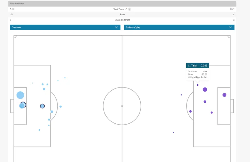 8分鐘第一個(gè)進(jìn)球就來(lái)自于強(qiáng)側(cè)姆貝膜邊路左腳斜傳到禁區(qū)無(wú)人盯防的桑德芒特,左腳卸球右腳抽射1:0,知錯(cuò)動(dòng)作連貫流暢很輕松,改先高位黑貓的贏球防守太松散了,沒(méi)有給到任何壓力,不管是持球人還是禁區(qū)前在的二點(diǎn)威脅。本場(chǎng)比賽發(fā)揮得不錯(cuò)的另外一名球員塞斯科在20分鐘接到B費(fèi)傳球后標(biāo)準(zhǔn)的中鋒職責(zé)分球到右邊路迪亞洛,后者內(nèi)切完成一腳質(zhì)量不錯(cuò)的射門(mén)。25分鐘同樣是強(qiáng)側(cè)姆貝膜邊路傳中球到后點(diǎn)達(dá)洛特沒(méi)停好,后續(xù)傳給芒特然后塞給禁區(qū)B費(fèi)挑射擊中門(mén)框,迪亞洛這次頭球補(bǔ)射的XG來(lái)到了將近0.6??傮w發(fā)揮一般的達(dá)洛特在30分鐘扔出了一個(gè)間接性的助攻幫助塞斯科搶點(diǎn)破門(mén)。在下半場(chǎng)右路強(qiáng)側(cè)的進(jìn)攻還在繼續(xù),70分鐘左右迪亞洛邊路突破分球給中路前插的卡塞米羅后者打飛。
