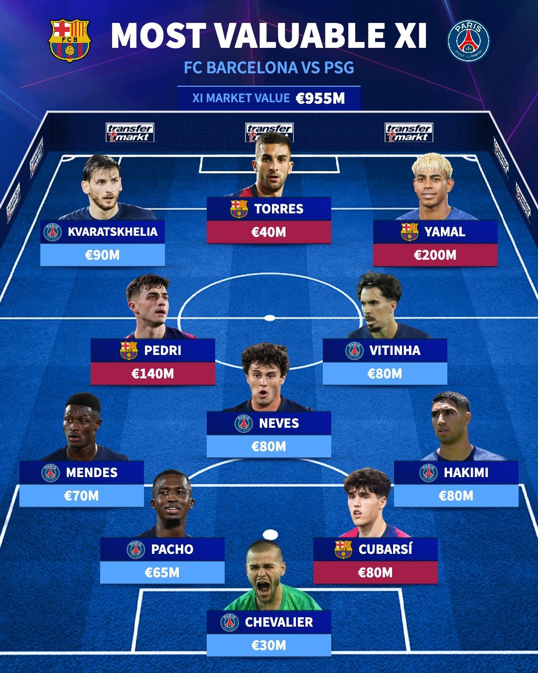 賽前,德國轉(zhuǎn)會市場按照身價(jià),將兩隊(duì)球員組合成了一套最貴陣容。