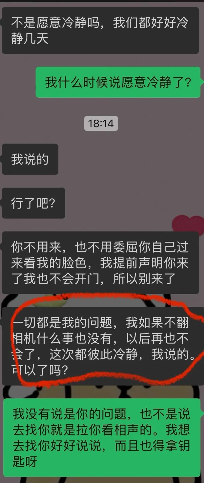 第一件事比較離譜。在一起之后她翻我手機(jī)翻得很細(xì),手機(jī)相冊、已刪除相冊、微信微博之類的翻了個(gè)底兒掉,我說實(shí)話不怕翻,但很介意。前女友、相親對象的微信很早就刪干凈了,但她好像就必須翻出點(diǎn)什么問題,看我微信很干凈,就翻我和好兄弟的聊天記錄,一直翻到一年前,我和兄弟說去相親了,當(dāng)時(shí)那個(gè)相親對象第一面印象不錯(cuò)(真的是一年前的,見了兩面就沒聯(lián)系了),我就夸了幾句。她直接就紅溫了,說我對她的喜歡和別的相親對象也沒什么不同,只是恰好是她,如果現(xiàn)在遇到的是一年前的那個(gè)人,我也會和那個(gè)人在一起,我和她在一起只是想找個(gè)人結(jié)婚、不是因?yàn)橄矚g她之類的。這次鬧得很嚴(yán)重,她很決絕的要分手,最后我很低聲下氣哄回來了。