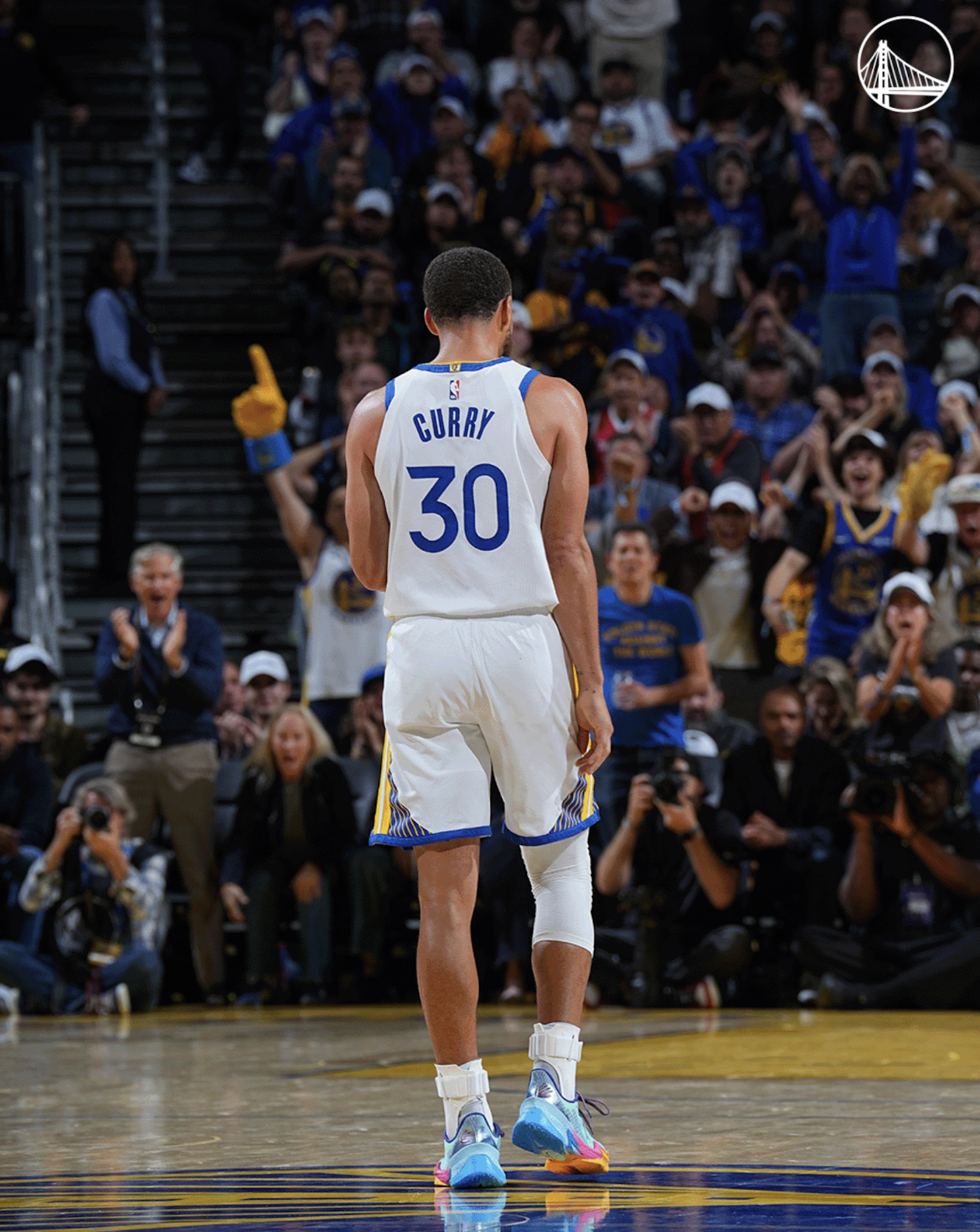 勇士官媒更新了X,平分曬出了球員斯蒂芬-庫里的勇士賽場照。