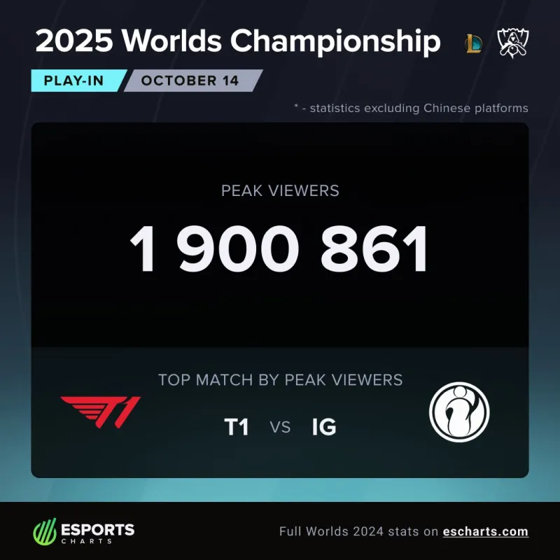 虎撲10月14日訊 外媒Esports Charts統(tǒng)計S15全球總決賽入圍賽峰值已達190萬,已超越S14全球總決賽入圍賽的峰值140萬。