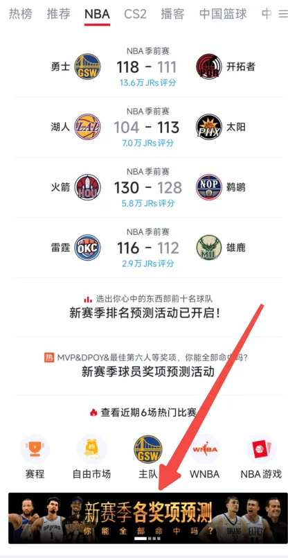 點擊NBA賽事首頁banner,預(yù)測即可直接進(jìn)入: