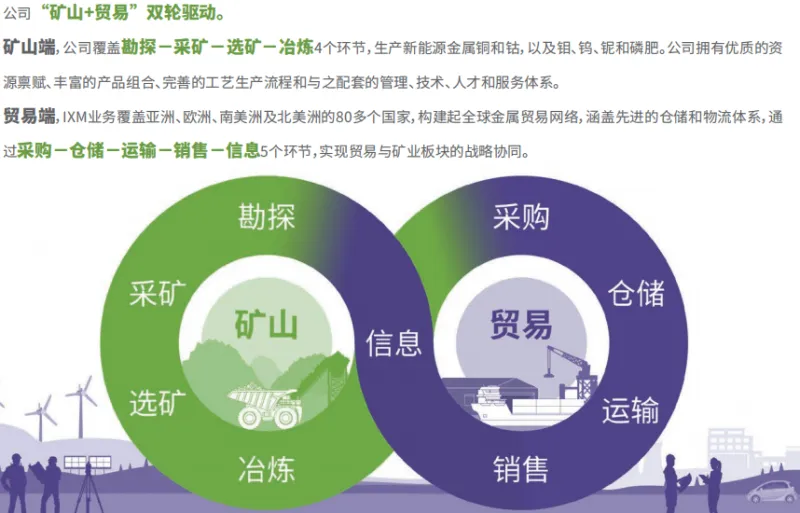 貿(mào)易業(yè)務(wù):通過子公司IXM(國際金屬交易平臺)將礦山產(chǎn)能延伸至全球商品交易,營業(yè)收入553.71億,占比約58%(扣除內(nèi)部抵消部分)。