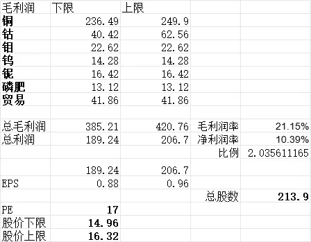 計算過程主要算銅(利潤68.8%)、鈷(利潤17.67%)板塊,其他板塊因為利潤占比較小,所以可以直接用半年報數(shù)據(jù)×2來推算全年。然后計算Eps,