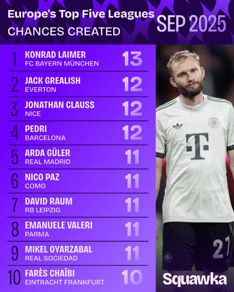 來(lái)源:X虎撲10月01日訊 Squawka統(tǒng)計(jì)了2025年9月份歐洲五大聯(lián)賽創(chuàng)造機(jī)會(huì)次數(shù)最多的球員: