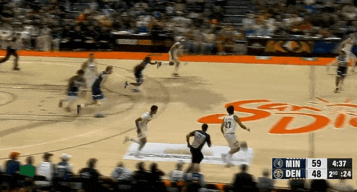 第二節(jié)比賽,板起賈馬爾-默里反擊空接助飛布勞恩,飛賈高高躍起上籃打進。板起
