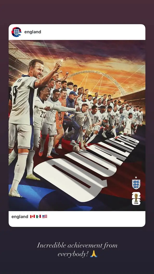祝英來源:Instagram 祝英虎撲10月15日訊 世歐預(yù)第八輪,英格蘭客場(chǎng)5-0拉脫維亞,媒慶提前晉級(jí)26年世界杯。祝英