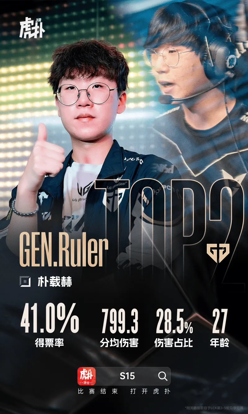 GEN.Ruler以41.0%的得票率當(dāng)選S15全球總決賽No.2選手。