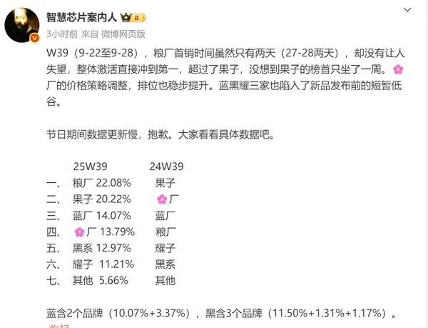 以下是2025年第39周(9月22日至9月28日)中國(guó)手機(jī)市場(chǎng)份額的具體數(shù)據(jù):