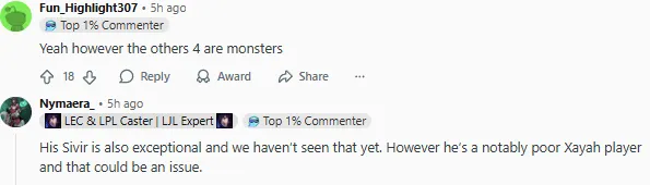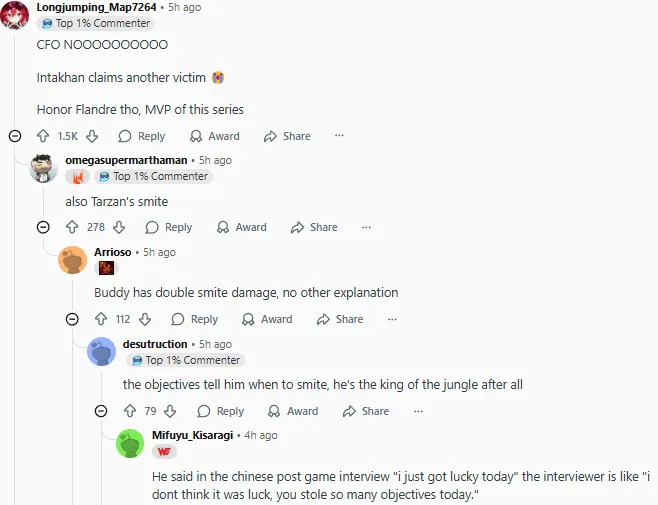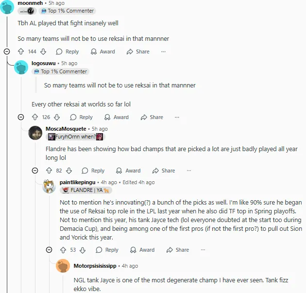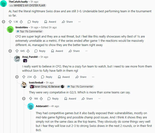S15瑞士輪AL以2-1戰(zhàn)勝CFO,最終以3-0的戰(zhàn)績(jī)率先晉級(jí)淘汰賽階段。賽后國(guó)外論壇Reddit引發(fā)熱議,部分評(píng)論翻譯如下: