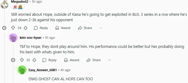 仍然對(duì)Hope感到擔(dān)憂,除了卡莎之外,他在BO5中會(huì)被針對(duì)。連續(xù)三個(gè)系列賽他都落后對(duì)位選手2-3k經(jīng)濟(jì)。