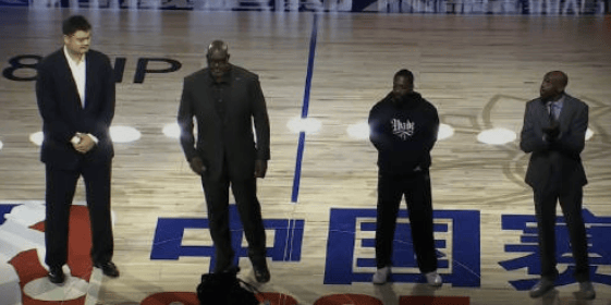 第二節(jié)比賽,板奧奧尼爾和姚明暫停期間登場亮相,和姚現(xiàn)場球迷歡聲雷動(dòng)。明暫迷歡