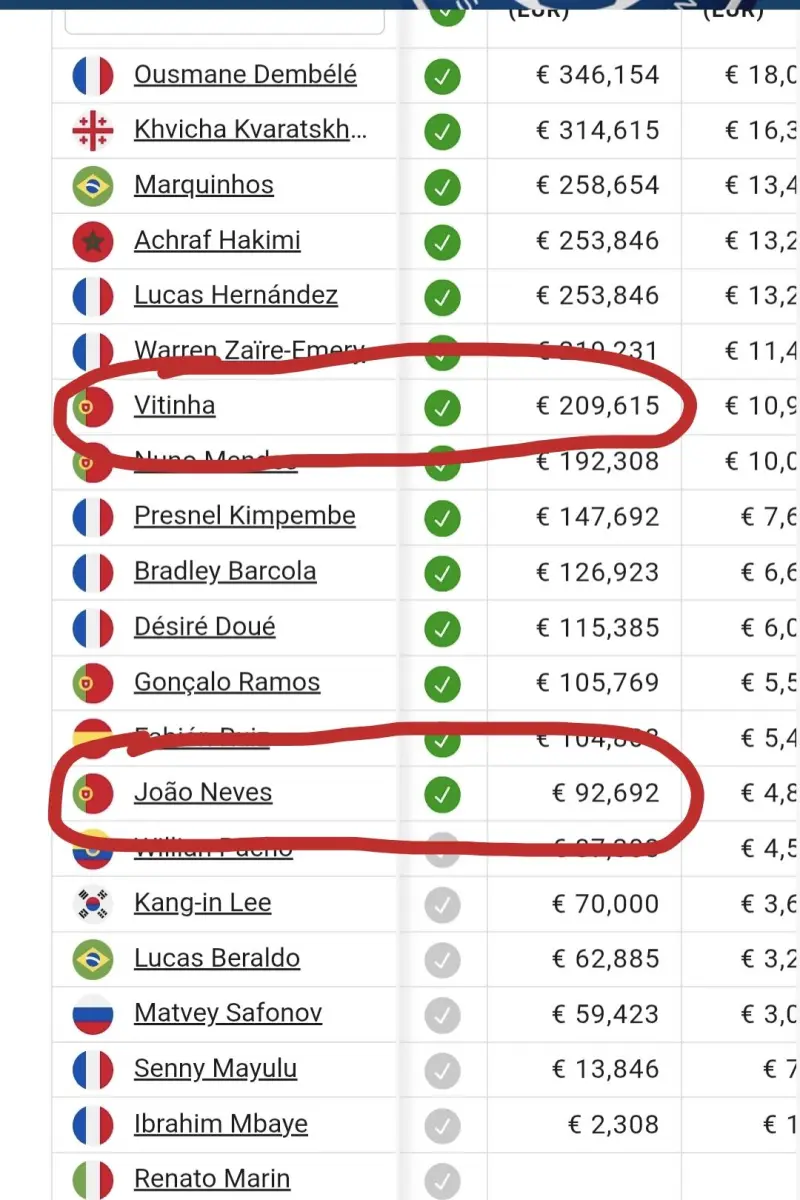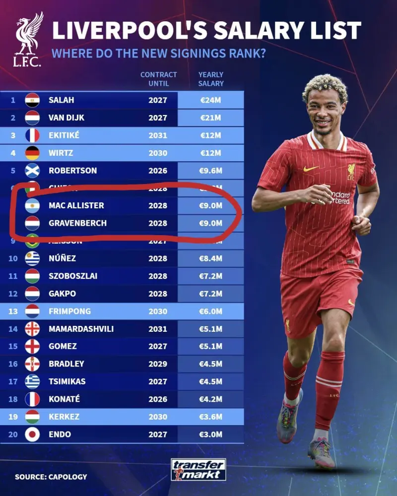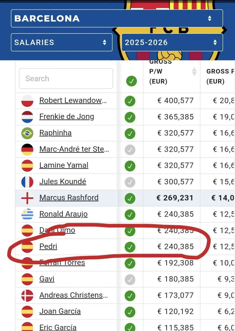 1400萬歐=23.333萬歐周薪,比上面所有人都高,德容上賽季后半段發(fā)揮是還行,一個合格的首發(fā)中場,但是他實力比上面哪個強?怎么23.33萬歐周薪這么委屈他???巴薩能爭第一中場不是靠佩德里?那我們來看看佩德里多少周薪呢,哦 24萬歐啊