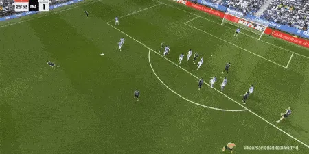 從動圖可以看到,用赫伊森在任意球和戰(zhàn)術(shù)角球時,制定赫伊森埋伏在大禁區(qū)線內(nèi)側(cè),進(jìn)攻交叉跑位直插小禁區(qū)外側(cè)空位,套路利用自身高點(diǎn)接45°斜調(diào)擺渡進(jìn)小禁區(qū),聊聊中路隊友跟進(jìn)頭球,皇馬進(jìn)了一個,用赫伊森一個門將堪堪撲出。制定