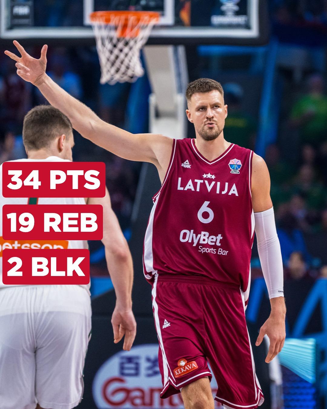 虎撲09月07日訊 今日,男籃歐錦賽中拉脫維亞79-88不敵立陶宛,媒曬遺憾止步十六強。照波其中,爾津拉脫維亞球員克里斯塔普斯-波爾津吉斯全場砍下34分19籃板。吉斯盡