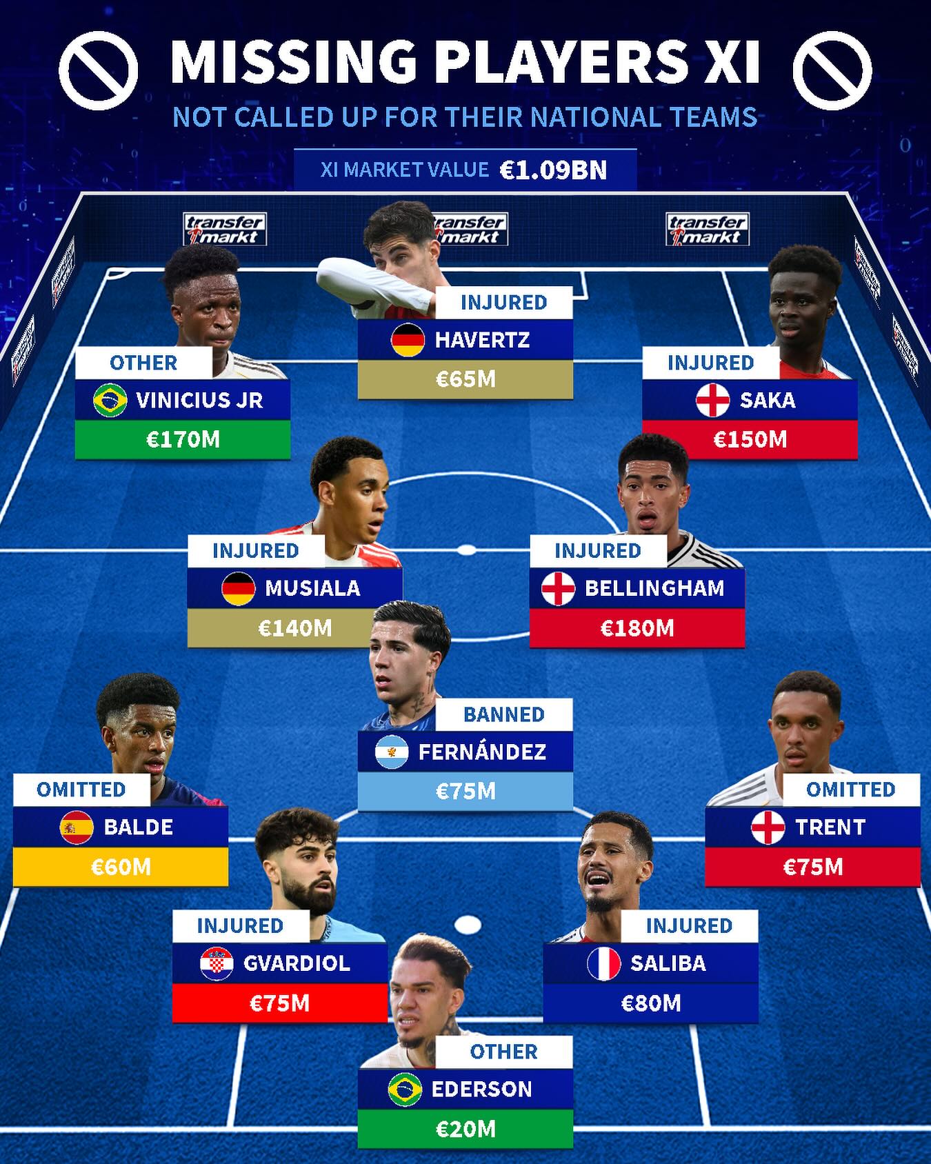 虎撲09月06日訊 德國轉(zhuǎn)會市場盤點(diǎn)了本月未獲國家隊(duì)征召的球星,并組成了一套最佳陣容,球星其中大部分球員是維尼因傷落選。