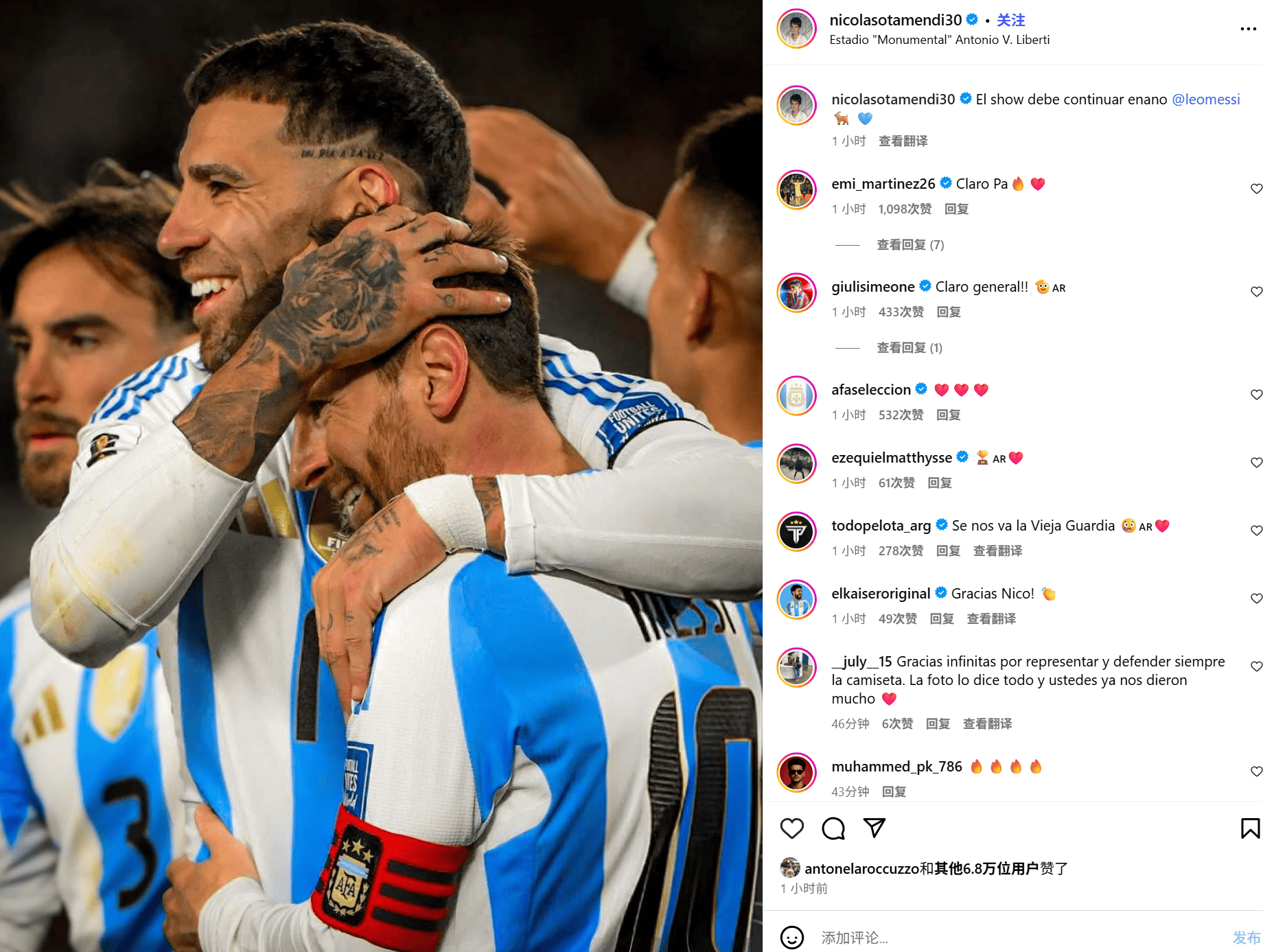 照片中,奧塔門迪曬出了自己摟著梅西的畫面,并配文寫道:“讓你的精彩表現(xiàn)繼續(xù)吧,梅西!”