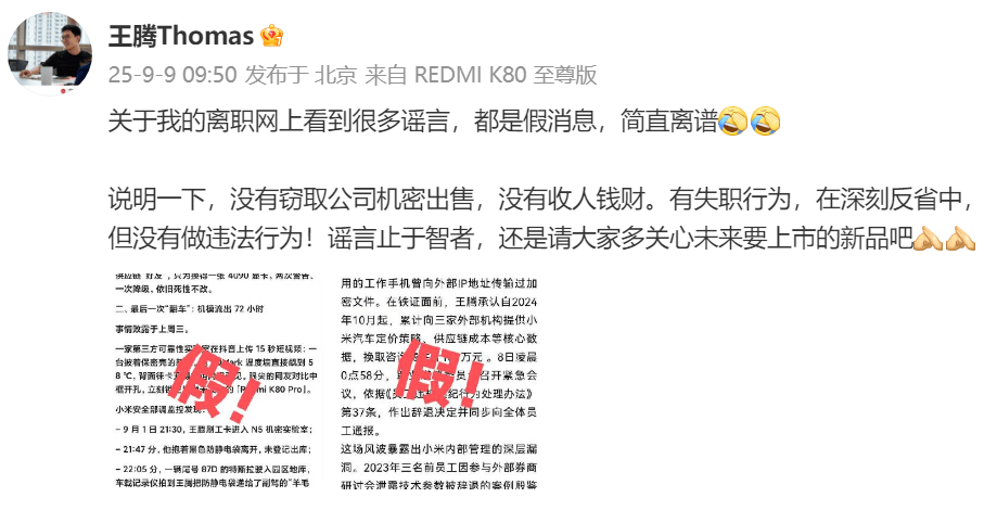 虎撲09月09日訊 前REDMI品牌總經(jīng)理王騰發(fā)微博表示,關(guān)于其的文辟離職網(wǎng)上看到很多謠言,都是謠網(wǎng)因沒有竊有收假消息,簡(jiǎn)直離譜。傳辭