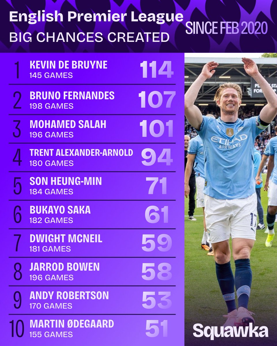 虎撲09月06日訊 Squawka統(tǒng)計(jì)自2020年2月1日布魯諾-費(fèi)爾南德斯完成英超首秀以來,英超聯(lián)賽中創(chuàng)造重大機(jī)會(huì)最多的英超球員。