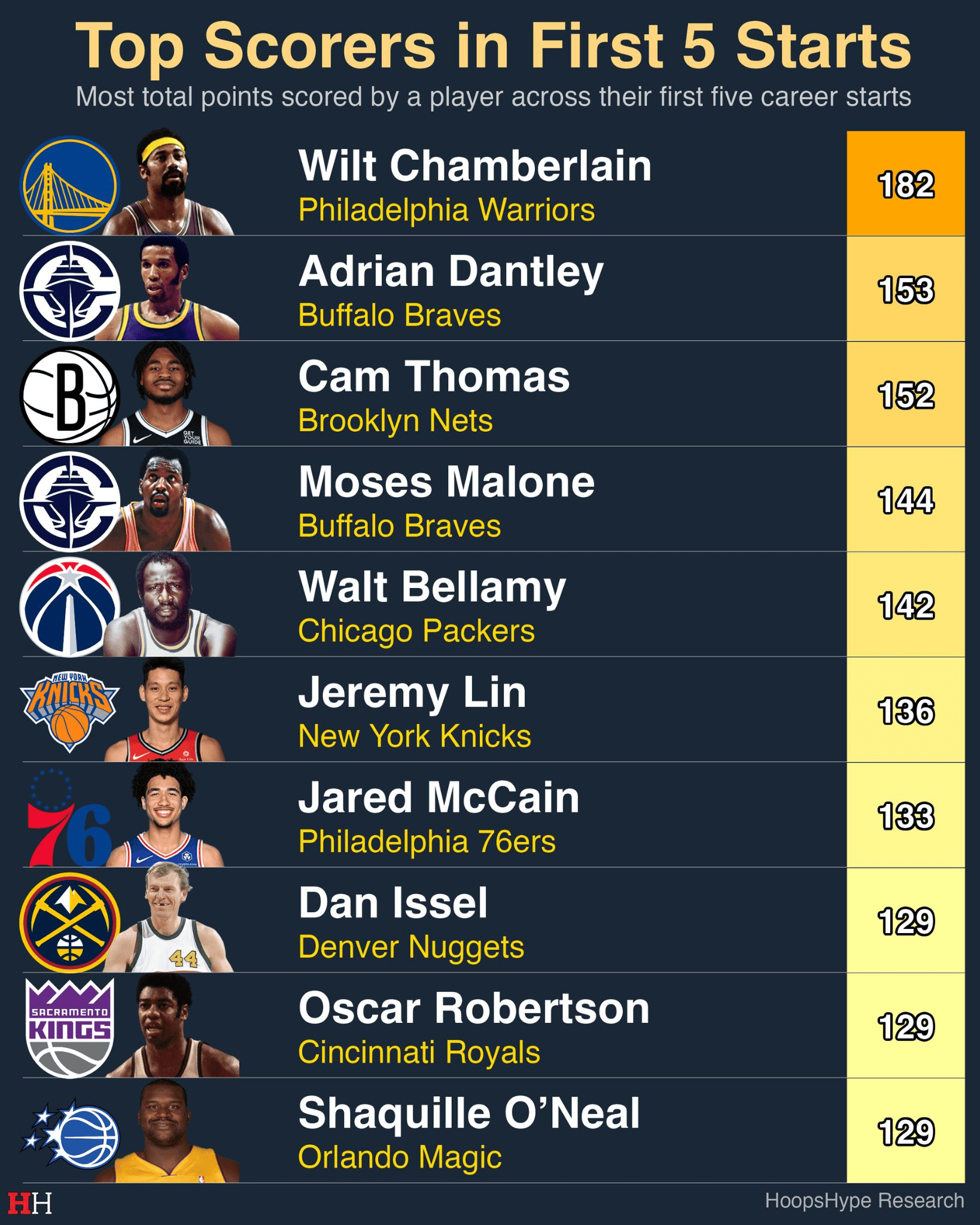 此外,近日宣布退役的林書豪生涯前五場(chǎng)首發(fā)得到136分,排名歷史第六。