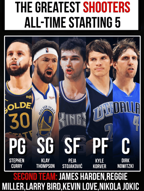 虎撲08月19日訊 今日,美國(guó)自媒體botopnext評(píng)出他認(rèn)為的湯普NBA歷史最佳射手陣容并配文: