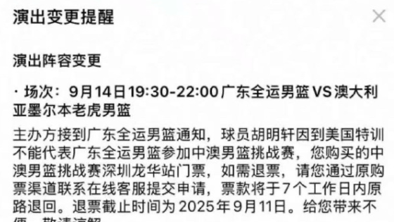 目前官方票務(wù)平臺(tái)發(fā)布最新公告稱,他們收到來(lái)自廣東全運(yùn)男籃的通知,球員胡明軒因赴美特訓(xùn),將缺席深圳站的熱身賽,其余兩站熱身賽或因時(shí)間緣由同樣缺席。