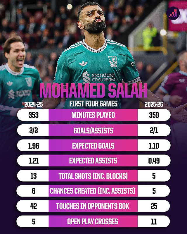 虎撲09月15日訊 據(jù)Opta數(shù)據(jù)統(tǒng)計(jì),盤點(diǎn)薩拉赫近兩個(gè)賽季英超前4輪數(shù)據(jù)對(duì)比。個(gè)賽