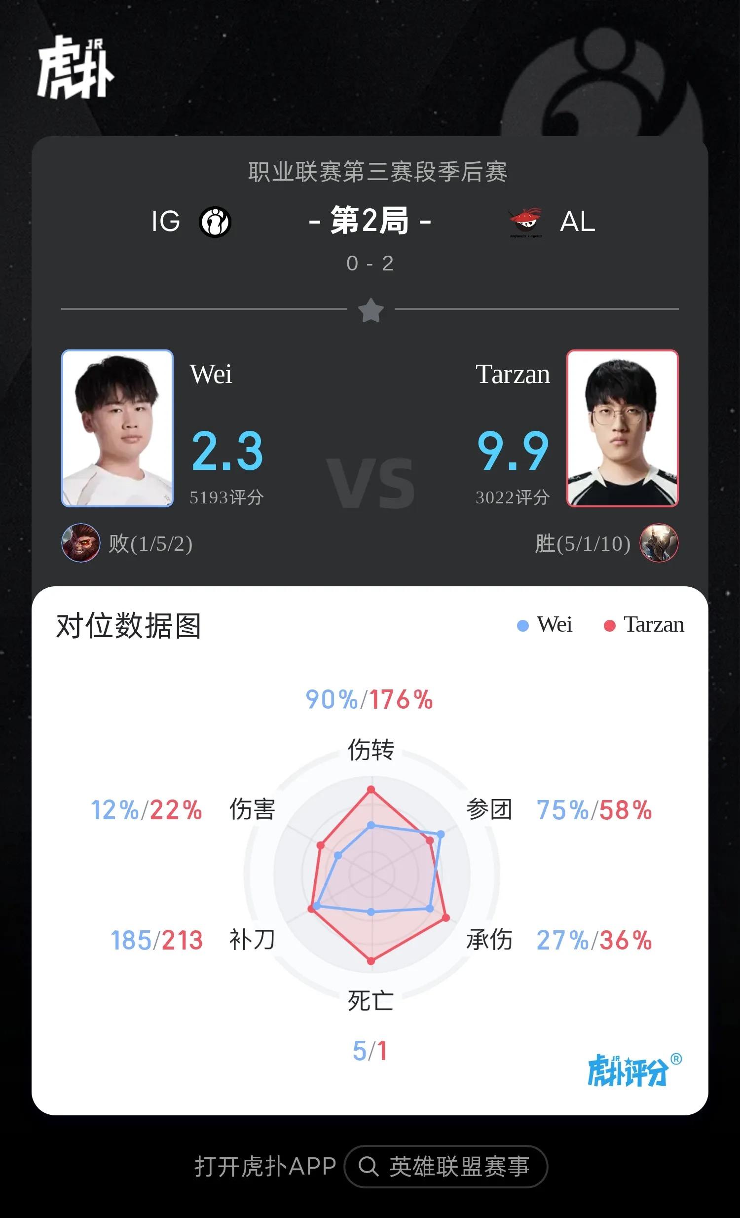 虎撲09月14日訊 在剛剛結(jié)束的LPL第三賽段季后賽AL對陣IG比賽中,Tarzan潘森打出5/1/10戰(zhàn)績,績拿局拿下AL對陣IG第二局MVP,對G第這是森打他第12個MVP,也是出戰(zhàn)他季后賽第4個MVP。