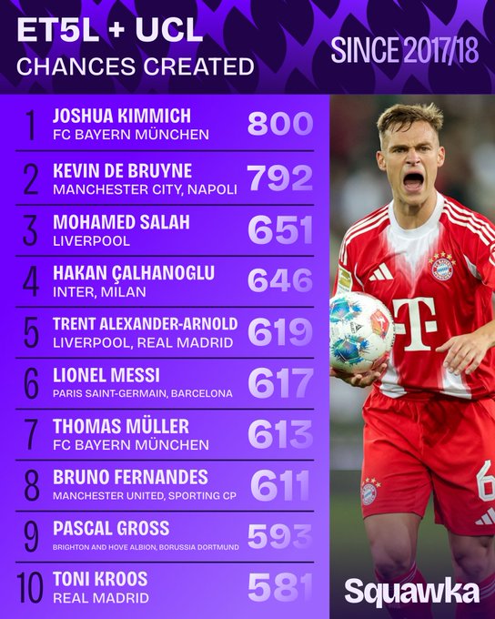 虎撲09月06日訊 據(jù)Squakwa統(tǒng)計(jì),自17/18賽季以來(lái)五大聯(lián)賽+歐冠創(chuàng)造機(jī)會(huì)榜,賽季賽歐其中基米希以800次居首。大聯(lián)