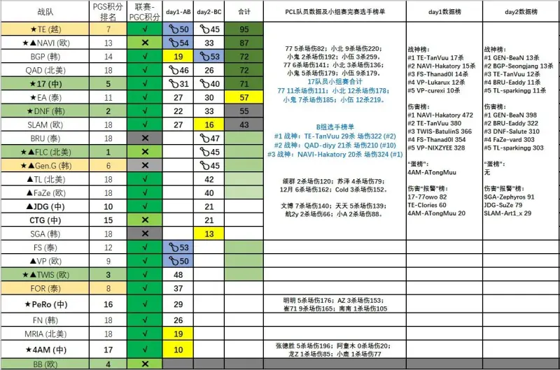 各隊day1、登隊day2積分、發(fā)D翻車吃雞情況、組賽PCL戰(zhàn)隊隊員詳細(xì)數(shù)據(jù)、報老P爆本坨day2選手?jǐn)?shù)據(jù)榜單和各隊PGS積分排名、登隊PGC晉級狀態(tài)等詳情表